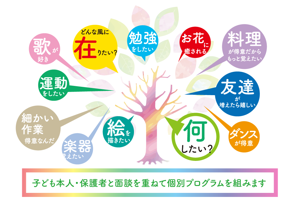 利用者本人・保護者と面談を重ねて個別の最適プログラムをご提案します。