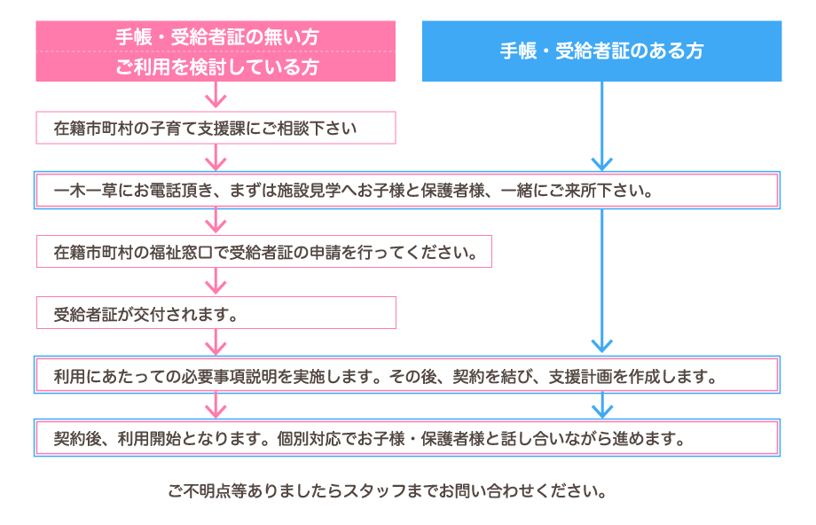 | ご利用方法 | 手帳・受給者証有無をまずはお知らせください。全体的な流れをご確認する場合は下記のチャートにてご確認ください。 |